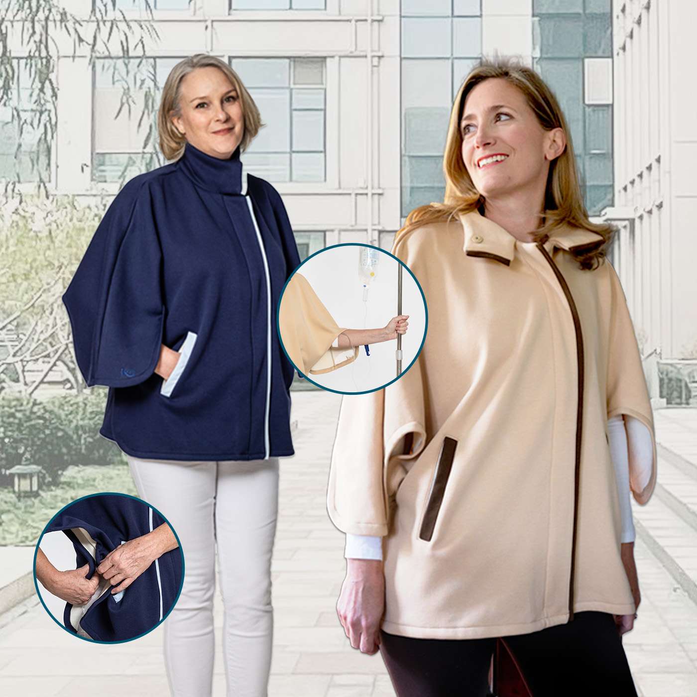 This is a good choice for those who undergo chemotherapy treatment, have a hospital stay, will receive treatment in an infusion center, or are recovering at home. Our Infusion Jacket keeps loved ones warm in chilly hospitals and infusion centers while providing easy access to IV, ports and PICC lines with our one button access. Made with a heavier fabric, this cape is super stylish and warm.