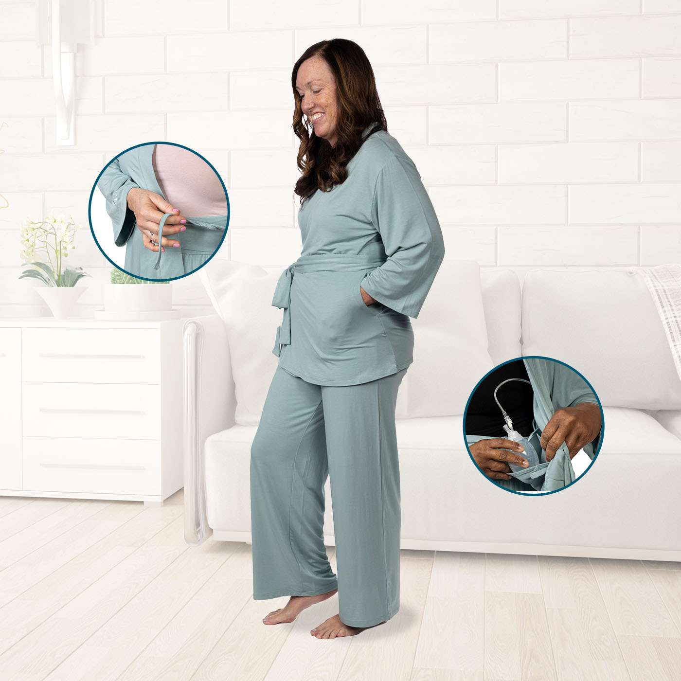 Our Home Recovery Pajamas are a good choice for women recovering post surgery at home or in a rehab center,  With moisture-wicking fabric that is breathable and insanely soft, these are the best pajamas for after breast surgery, post mastectomy, hysterectomy or any surgery that requires drainage bulbs.